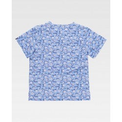 Túnica unissexo de manga curta com tecido elástico e estampado. Decote em bico com viés e elástico combinado. Um bolso no peito e dois laterais.