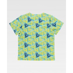 Túnica unissexo de manga curta com tecido elástico e estampado. Decote em bico com viés e elástico combinado. Um bolso no peito e dois laterais.