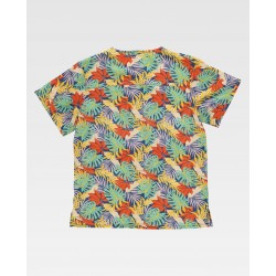 Túnica unissexo de manga curta com tecido elástico e estampado. Decote em bico com viés e elástico combinado. Um bolso no peito e dois laterais.
